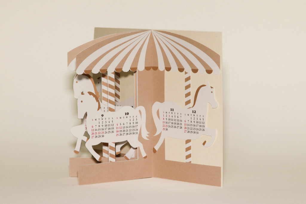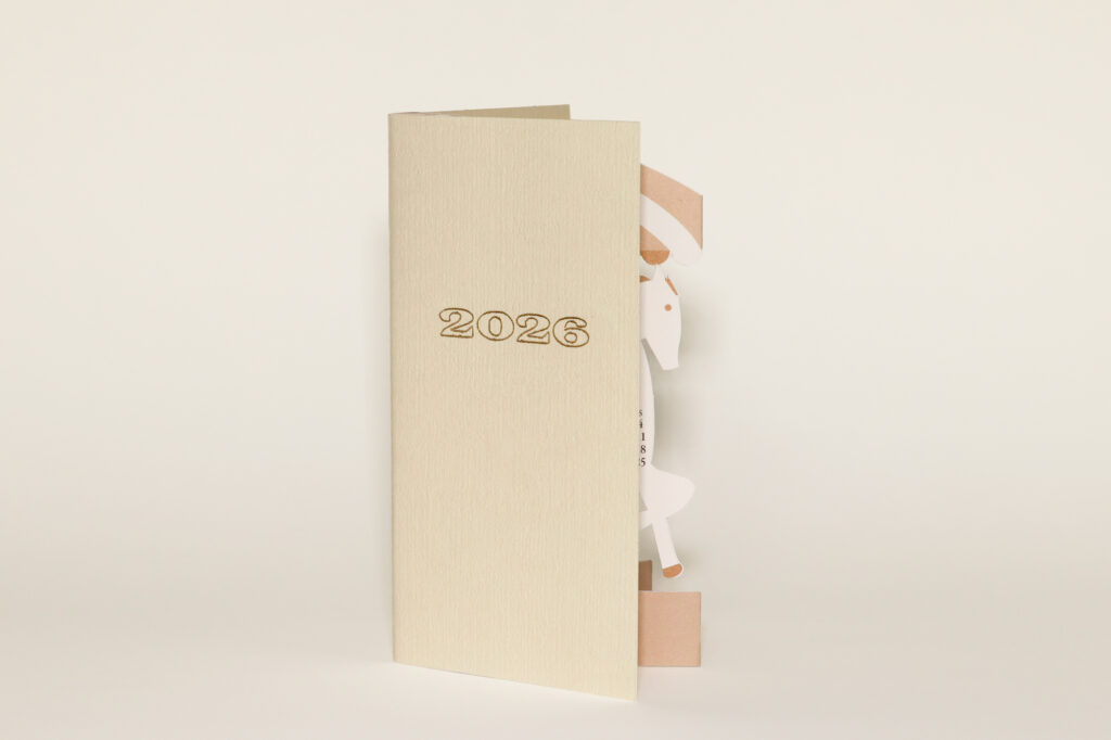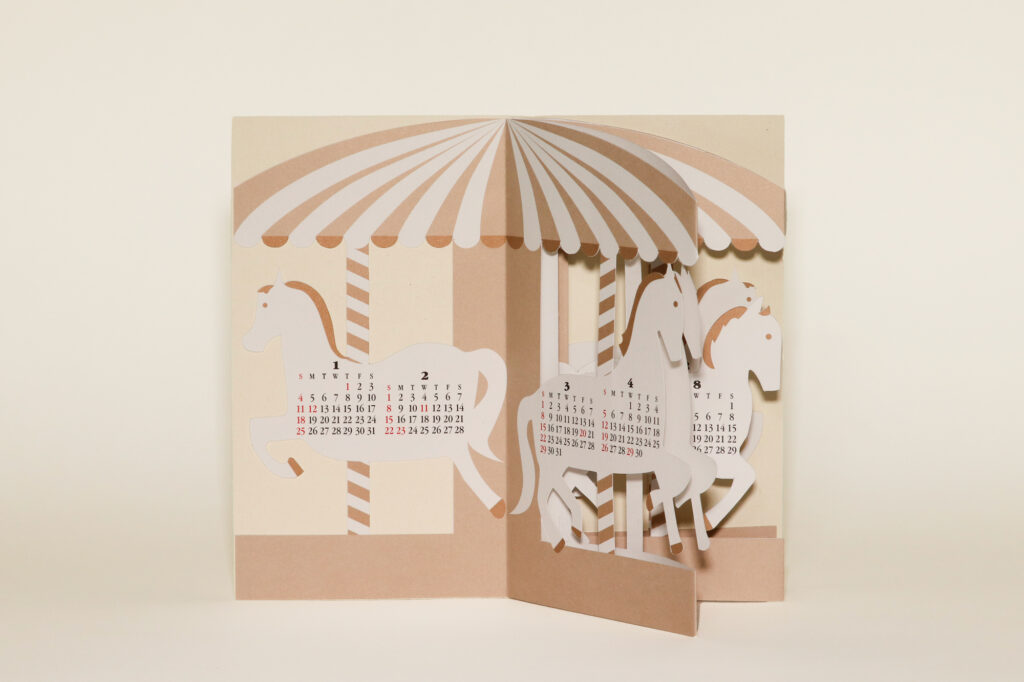 2026年の干支、馬をモチーフに、メリーゴーランド型にデザインしたカレンダーです。2026年1月から12月までが一面に2カ月ずつ掲載。二つ折りカードに貼り付けてありますが、広げると卓上カレンダーとして利用できます。
